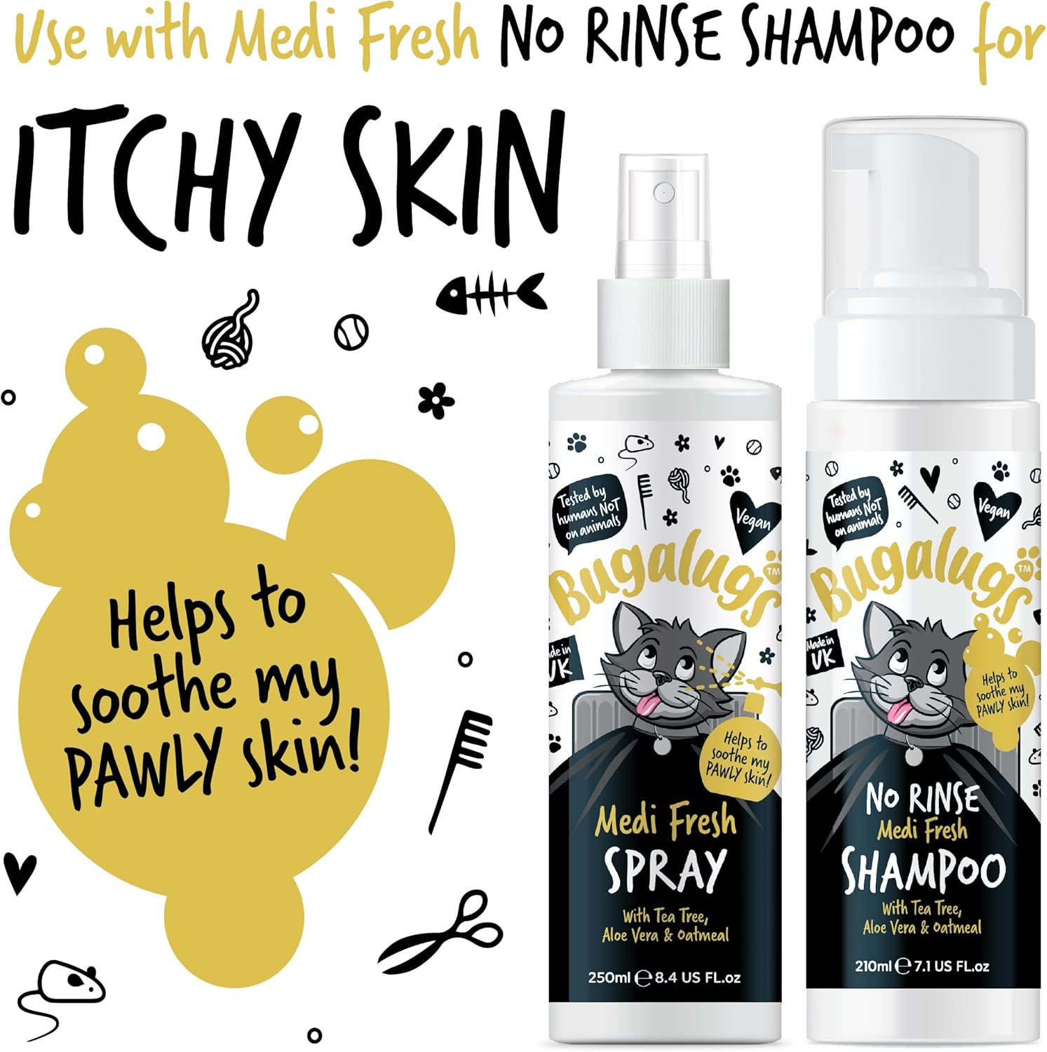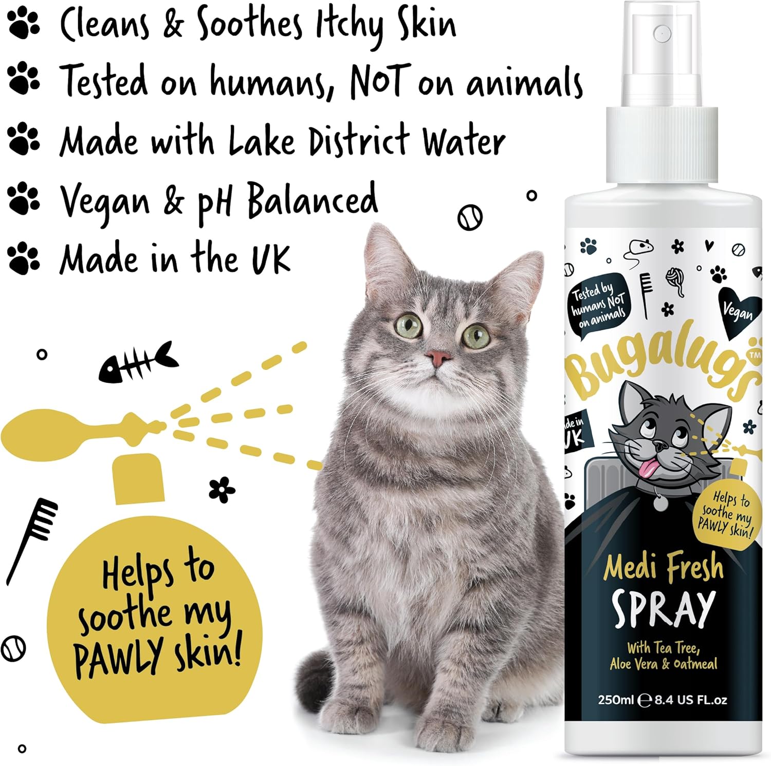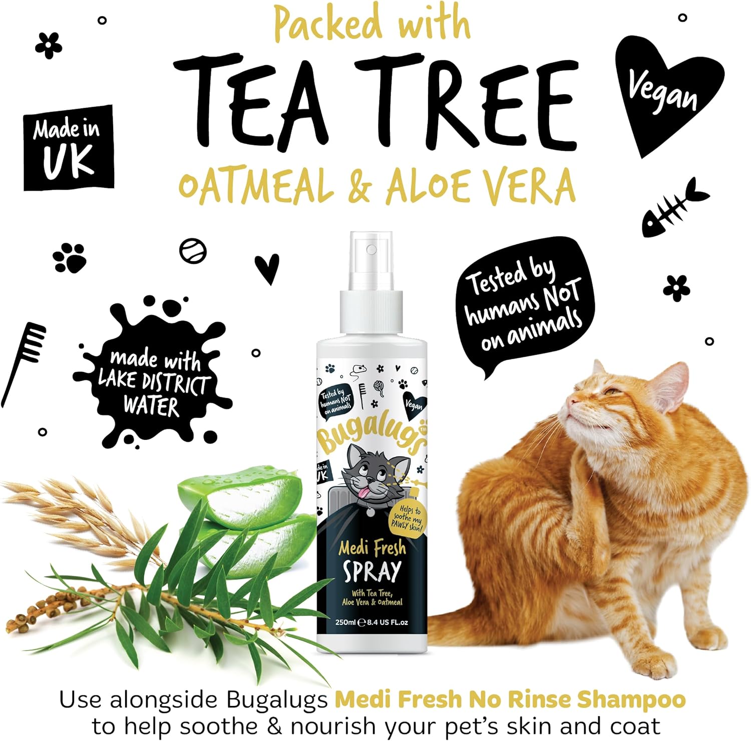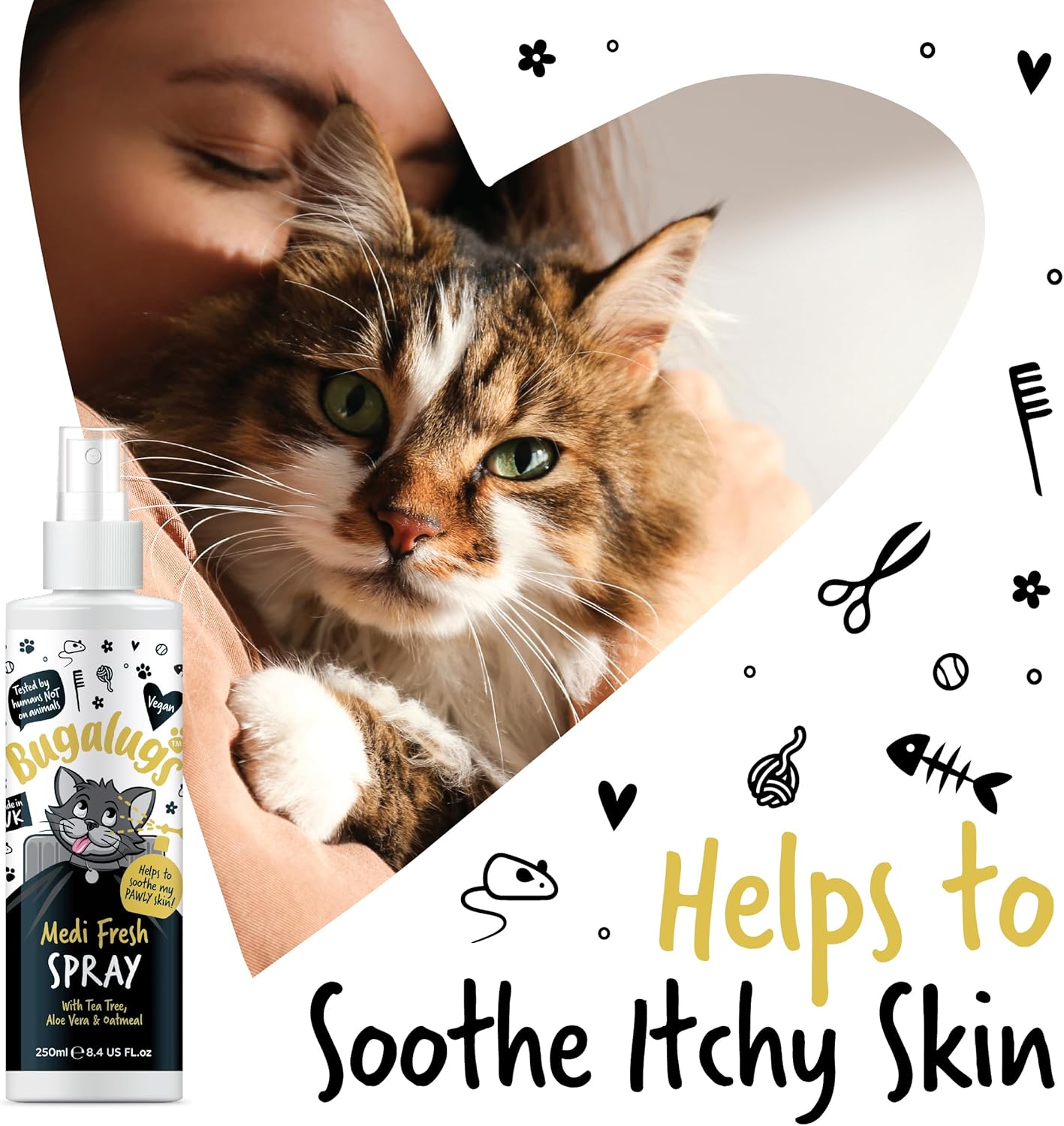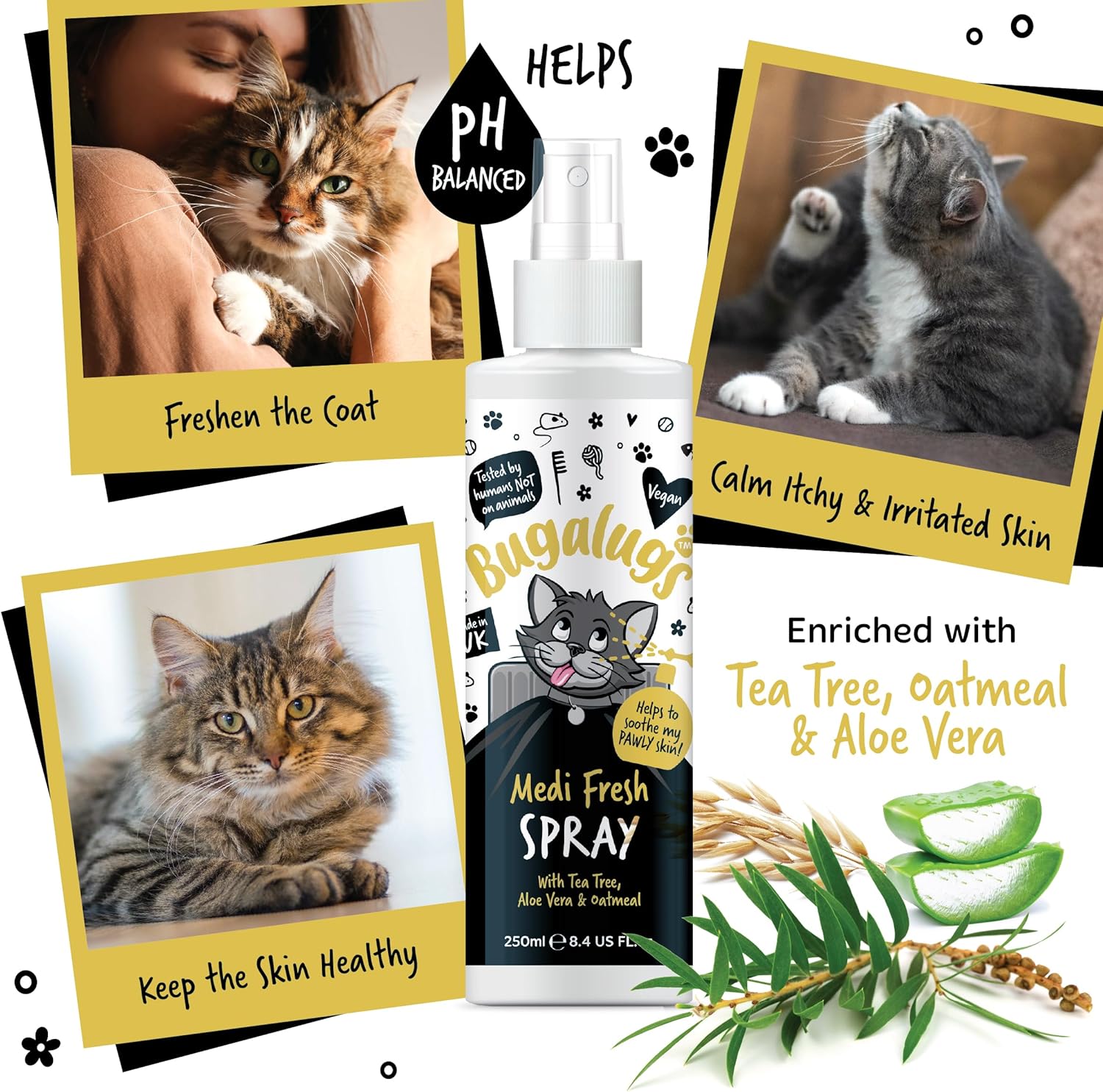 Keep your kitty smelling PURRfect and refreshed between washes with Bugalugs Cat itchy skin spray.This no rinse, naturally derived and soothing formula gently removes unpleasant odours from cat and kittens coats and skin and ensures they remain nourished and hydrated with our multi-action formula. Containing calming and soothing Tea Tree, Aloe Vera & Oatmeal and suitable for all cats and kittens – even those with sensitive skin. Simply spray onto a dry coat or skin after grooming or use in between washes to keep your cat’s coat smelling great! With our professional grade formulas, bugalugs is trusted by vets and pet owners across the world. Manufactured in the UK with water from the Lake District, a UNESQO World Heritage site.