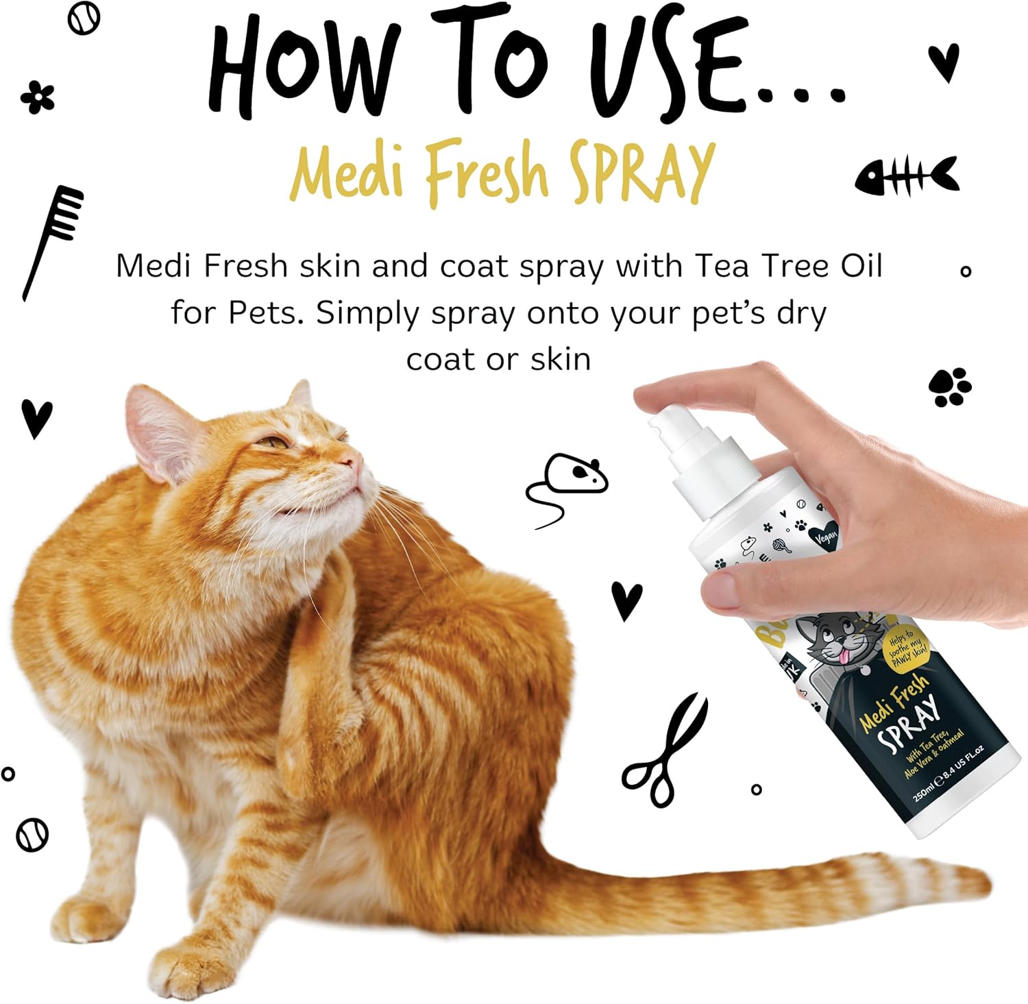 Feline fresh! – Swiftly refresh in between washes. Nourishes & hydrates the skin and coat while removing unpleasant odours. Contains Tea Tree, Aloe Vera, Oatmeal and is gentle on the skin
