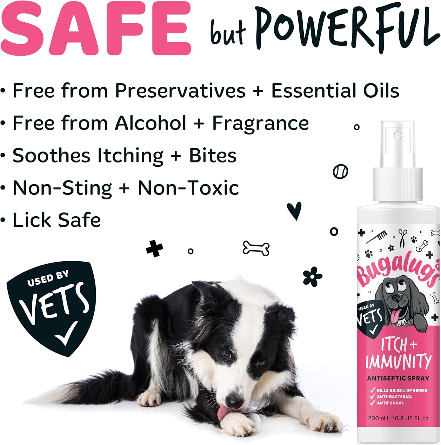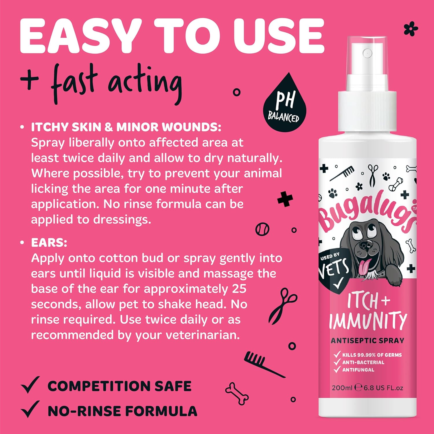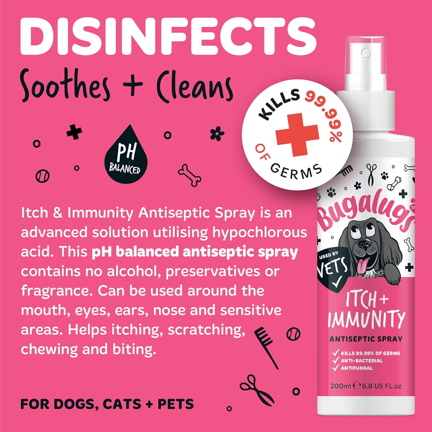 Safe for pets & animals – Bugalugs antibacterial spray for dogs, cats, birds, small pets, reptiles and livestock. It’s safe to use all over your pet, including eyes, ears, nose and around the mouth (Lick-safe)