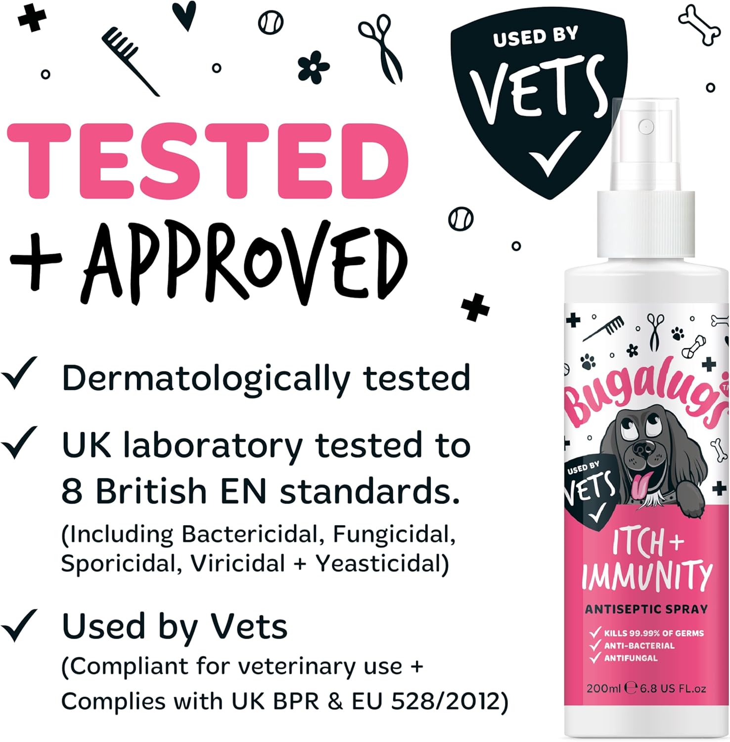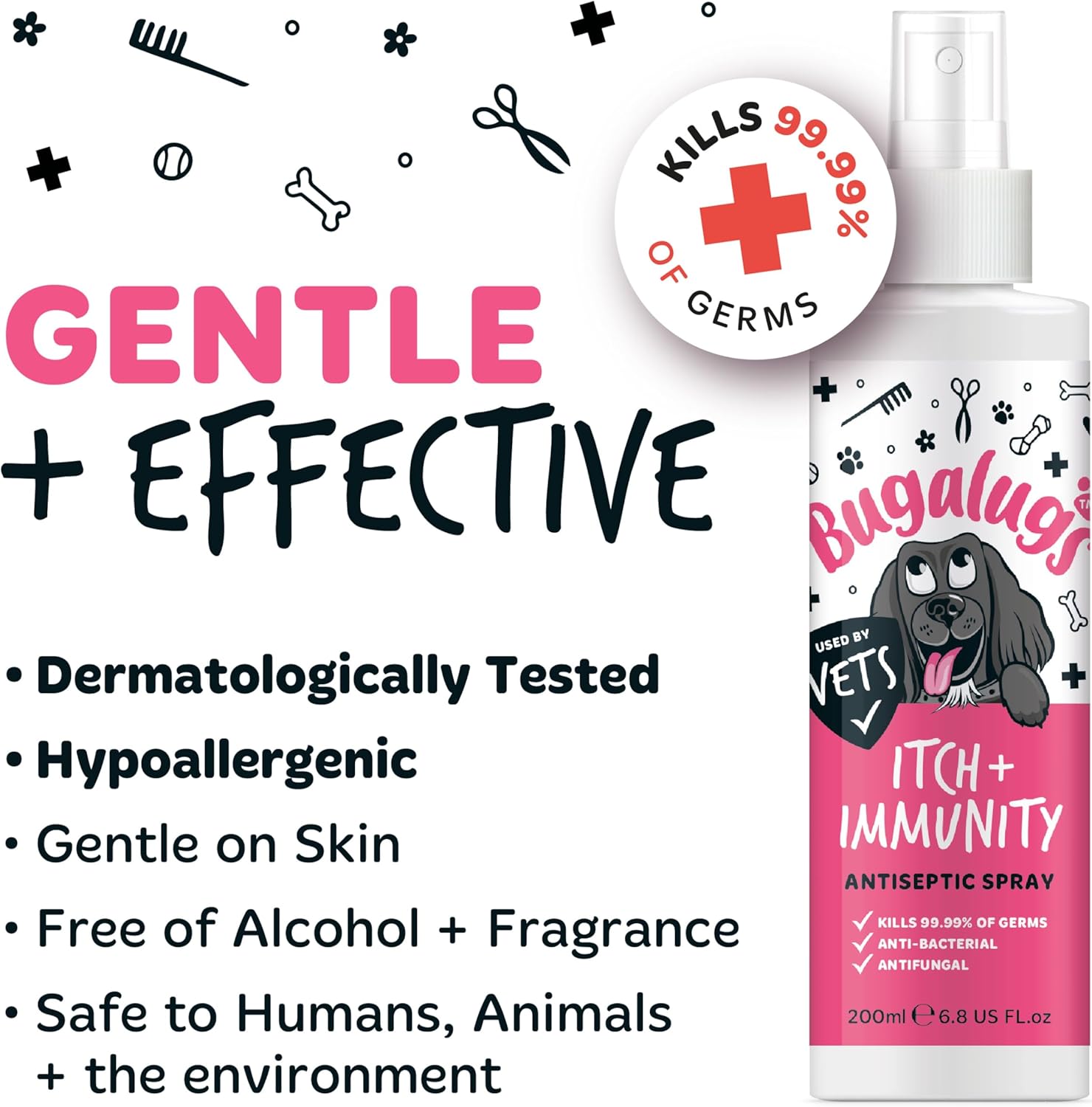 Itch & Immunity antiseptic pet spray is an essential part of your pet & dog first aid kit uk. Bugalugs Antiseptic dog spray is an ear and skin disinfectant utilising hypochlorous acid. Skin safe and vet approved for dogs & all animals, helps with itchy skin, ears odours, skin irritations and insect bites Dermatologically tested and Hypoallergenic, our antibacterial spray for dogs, antiviral and antifungal spray is gentle on skin, kill 99.99% of germs. This pH balanced spray is an antiseptic and contains no alcohol, preservatives, or fragrance and is made in the UK. This can be used around mouth, ears, nose, and sensitive areas. Suitable for use on dogs, cats, horses, birds, reptiles, and all other small animals.