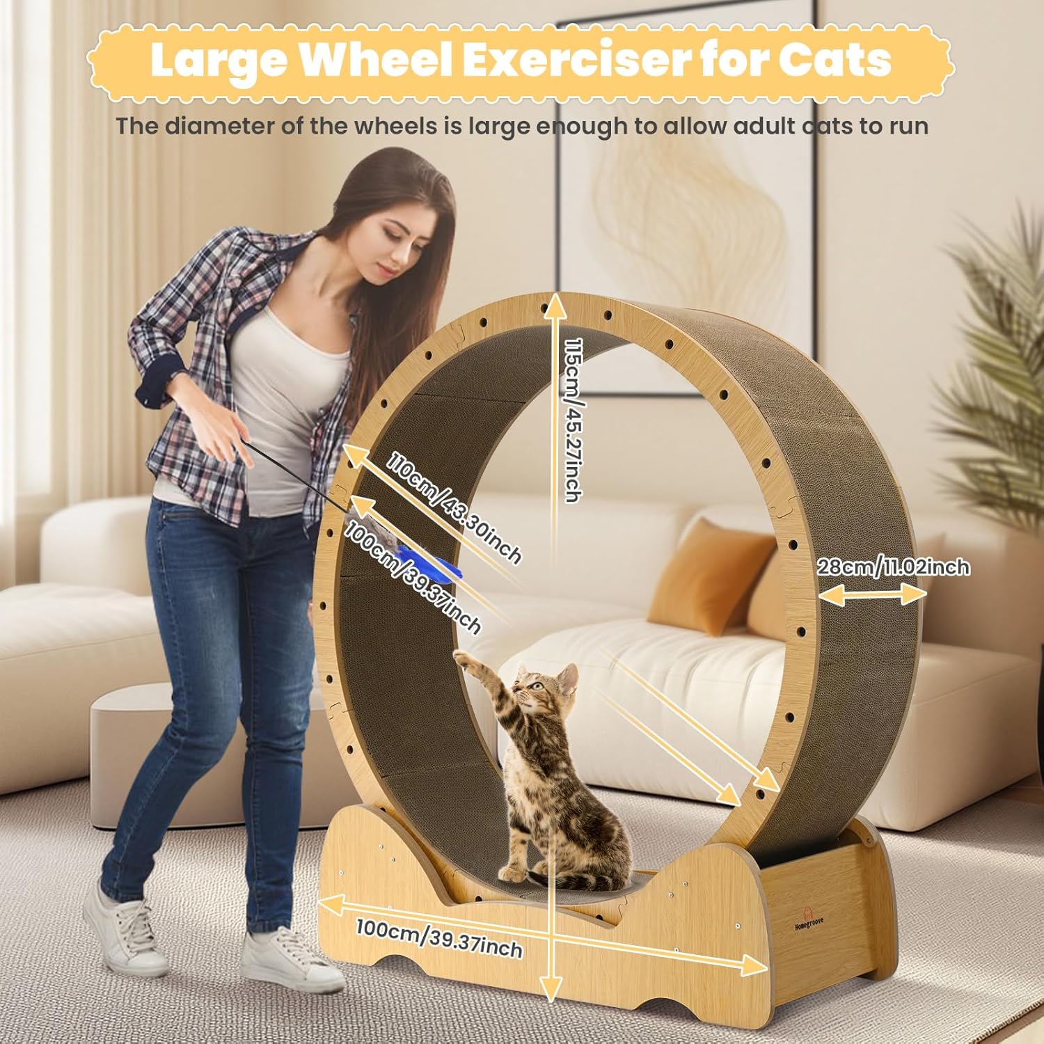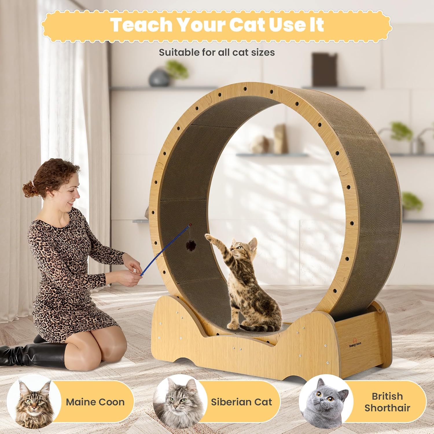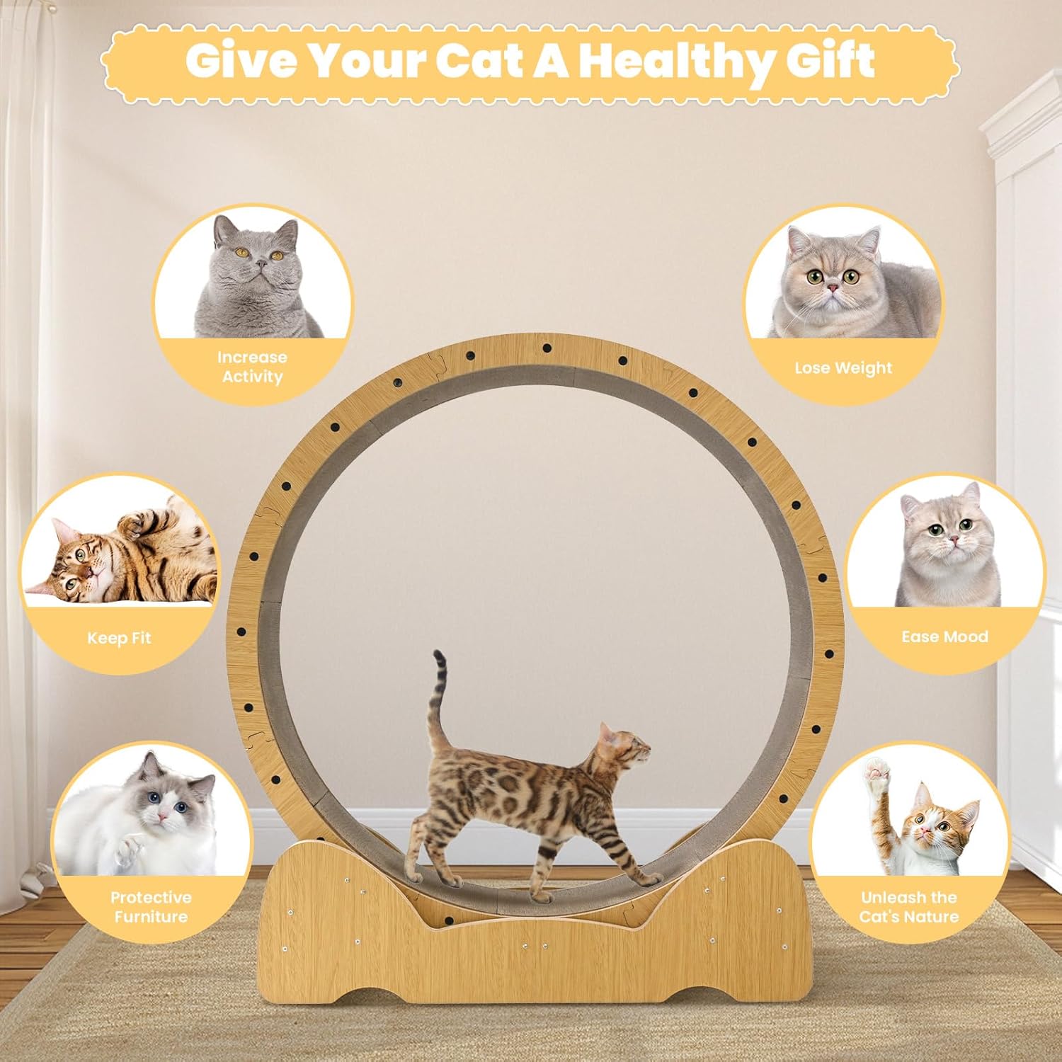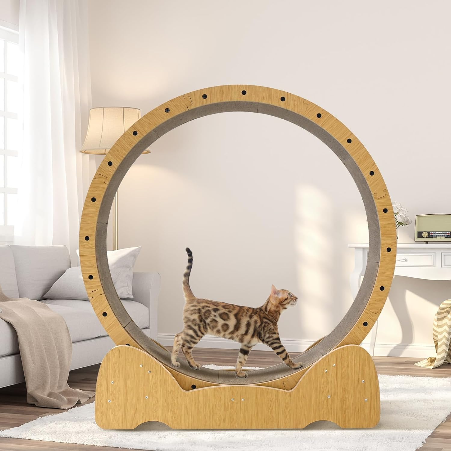 This modern-looking large cat wheel exerciser for indoor cats toy fits well into a variety of scenarios, and you can put cat wheels in your living room, bedroom, or cat toy room. You can also give rueda para gatos as a sweet present to your family and friends who have cats, or even as a surprise for your own cat to share life together and explore more fun.