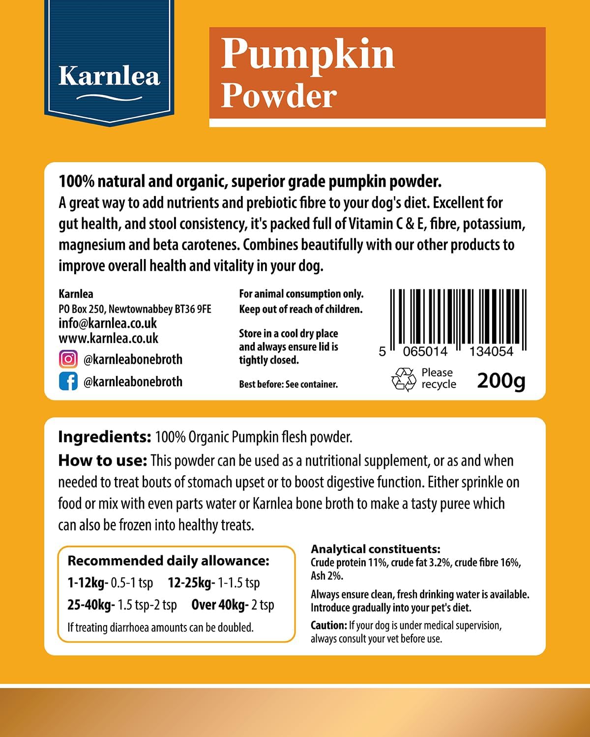 At Karnlea, we recognise that all pumpkin powders are not created equal. Our superior quality powder has been carefully sourced from the finest growers, from human grade facilities. our powder is then dehydrated and crushed to create a wonderful, nutrient dense product for your pets. Pumpkin is a rich source of vitamins including vitamin C and E and is rich in betacarotenes. It’s naturally prebiotic, so will help digestive issues, and to maintain gut health and the diversity of your pet’s microbiome. Just simply sprinkle on top of food, mix with broth or water to create a puree, which can also be frozen if you wish to act as a cooling treat.